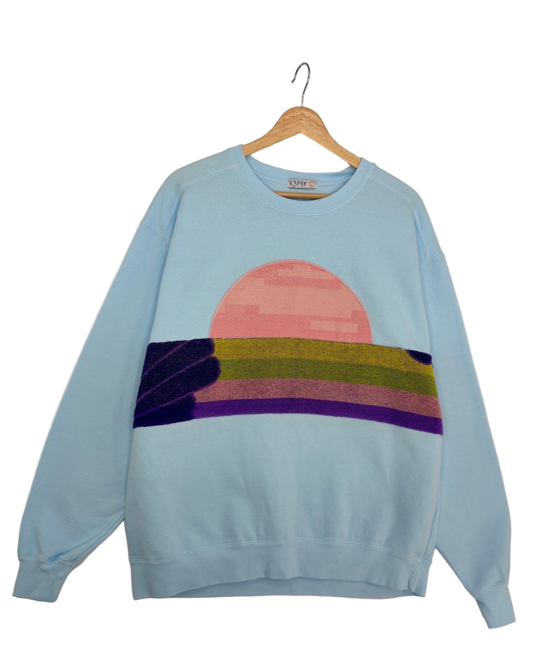 The Sunset Chaser Sweatshirt is a cozy, classic sweatshirt featuring a repurposed vintage beach towel horizon band and sun appliqué. Each piece is truly one-of-a-kind, making it as unique as the person wearing it.
