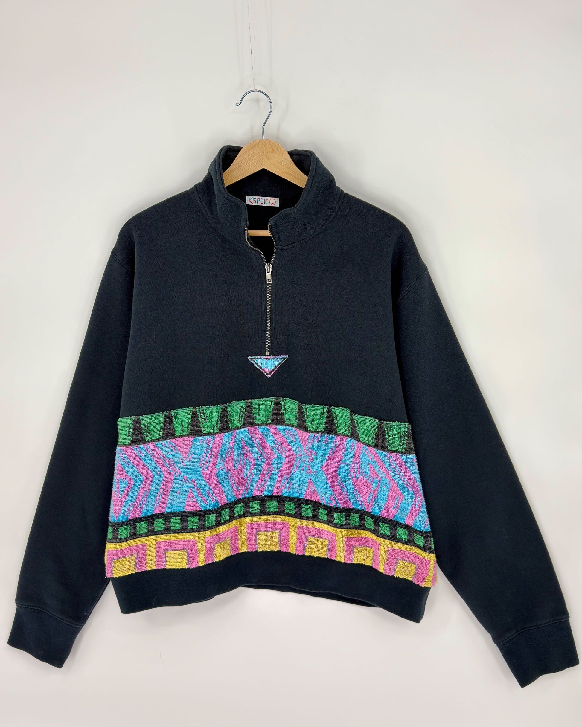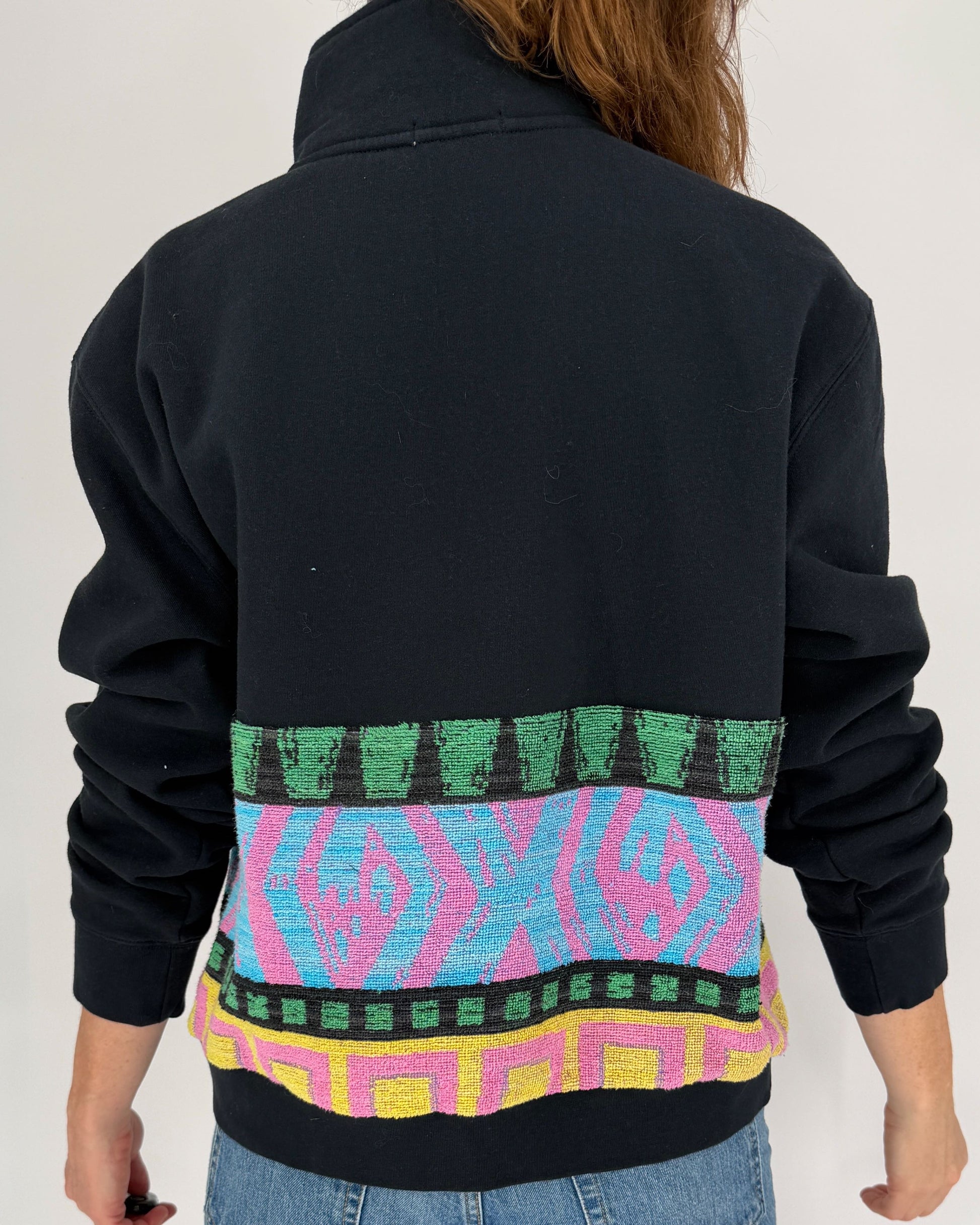 The Kspek 1/4 Zip Sweatshirt is a cozy, classic sweatshirt featuring a repurposed vintage beach towel piecing that goes all the way around to the back. Matching triangle applique at the bottom of the antique silver metal zipper. Each piece is truly one-of-a-kind, making it as unique as the person wearing it.