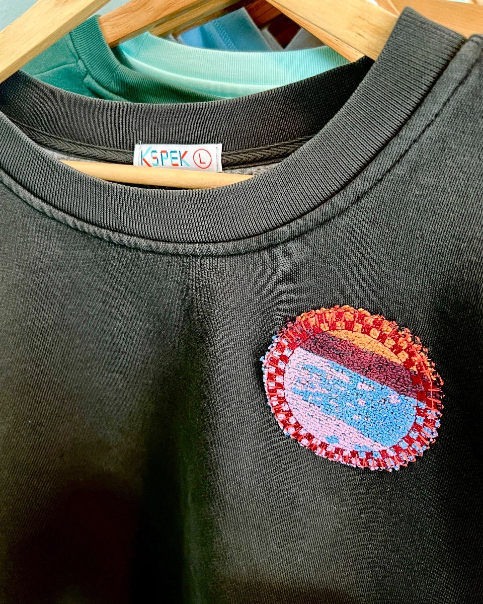 The Tide Check Sweatshirt is a cozy, classic sweatshirt featuring repurposed vintage beach towel bands at the sleeves and embroidered checkered design framing a circle patch at the chest. Each piece is truly one-of-a-kind, making it as unique as the person wearing it.