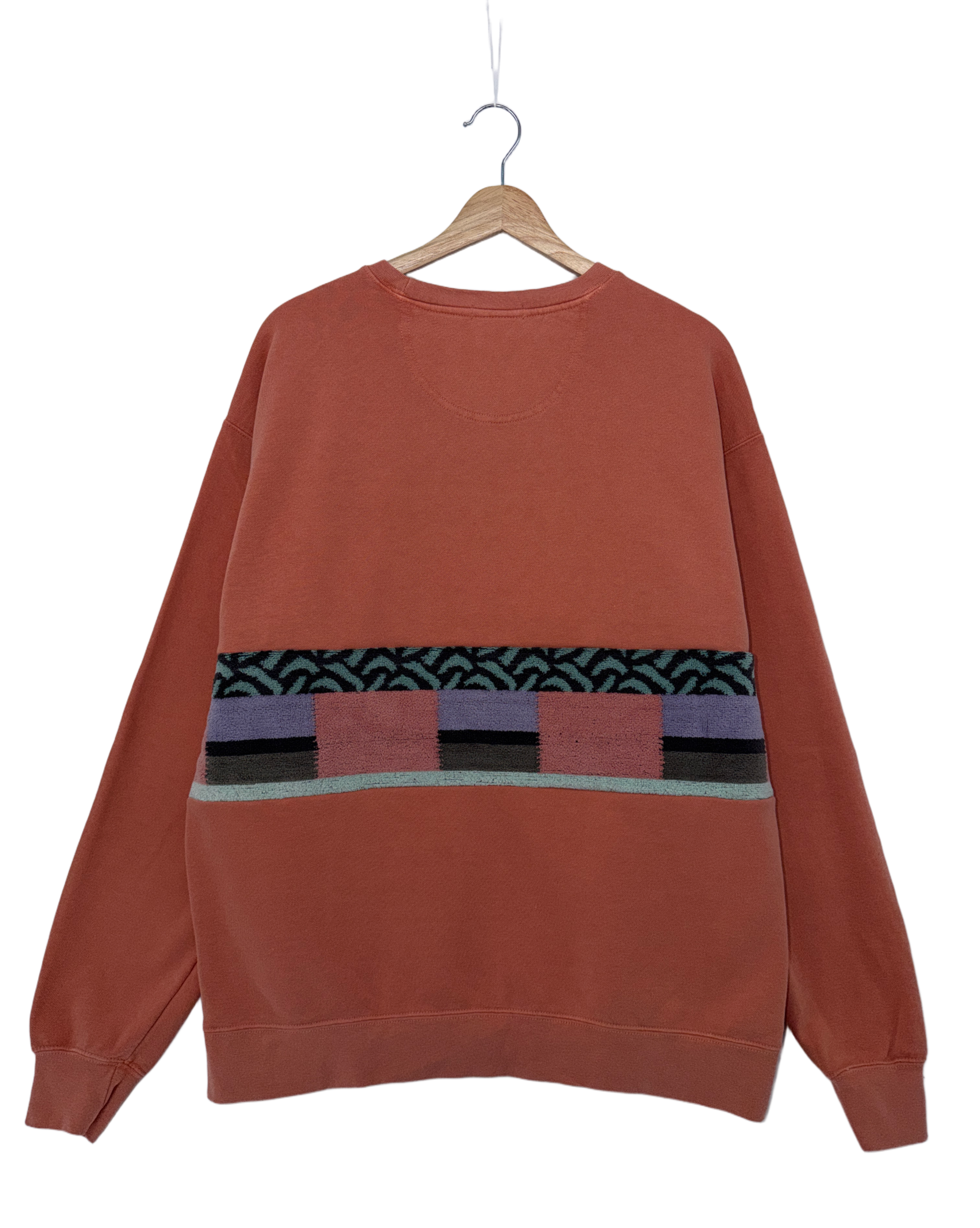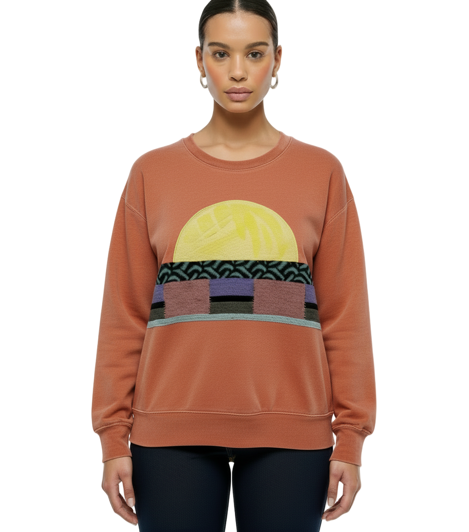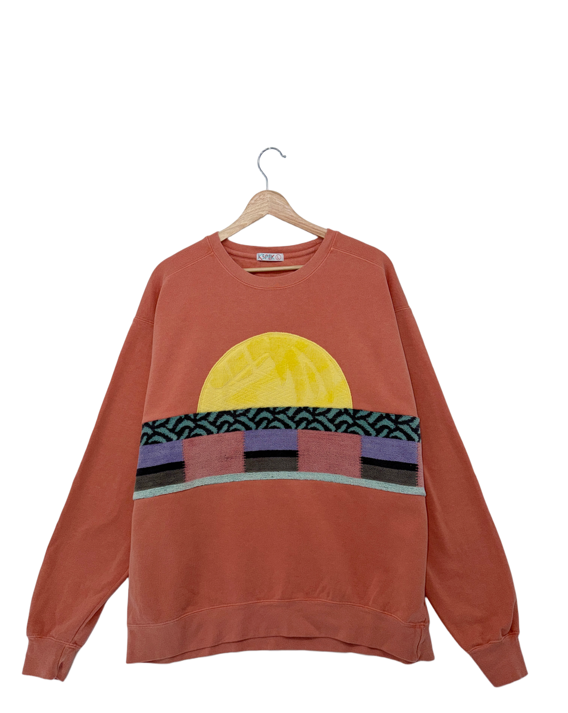 The Sunset Chaser Sweatshirt is a cozy, classic sweatshirt featuring a repurposed vintage beach towel horizon band and sun appliqué. Each piece is truly one-of-a-kind, making it as unique as the person wearing it.