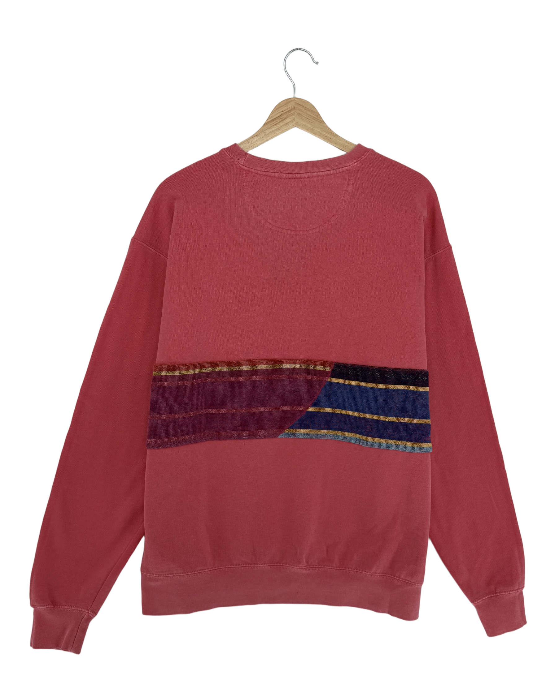 The Sunset Chaser Sweatshirt is a cozy, classic sweatshirt featuring a repurposed vintage beach towel horizon band and sun appliqué. Each piece is truly one-of-a-kind, making it as unique as the person wearing it.