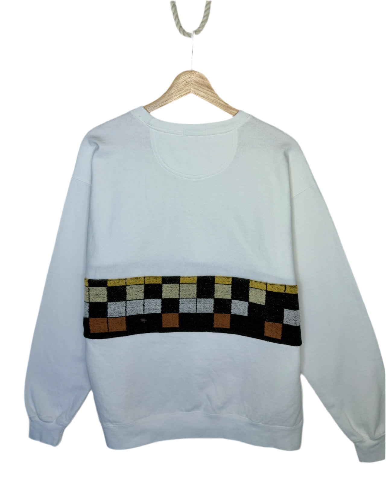 The Sunset Chaser Sweatshirt is a cozy, classic sweatshirt featuring a repurposed vintage beach towel horizon band and sun appliqué. Each piece is truly one-of-a-kind, making it as unique as the person wearing it.