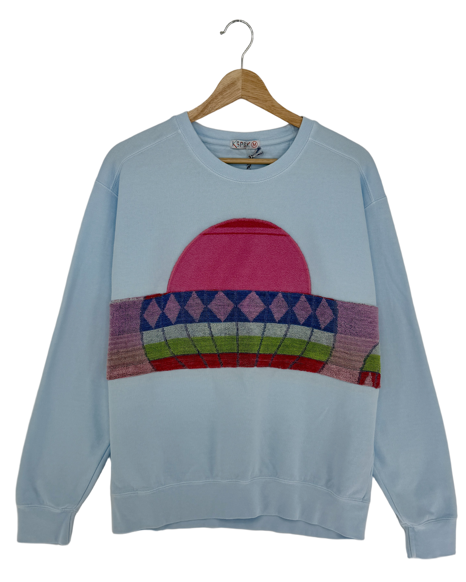 The Sunset Chaser Sweatshirt is a cozy, classic sweatshirt featuring a repurposed vintage beach towel horizon band and sun appliqué. Each piece is truly one-of-a-kind, making it as unique as the person wearing it.