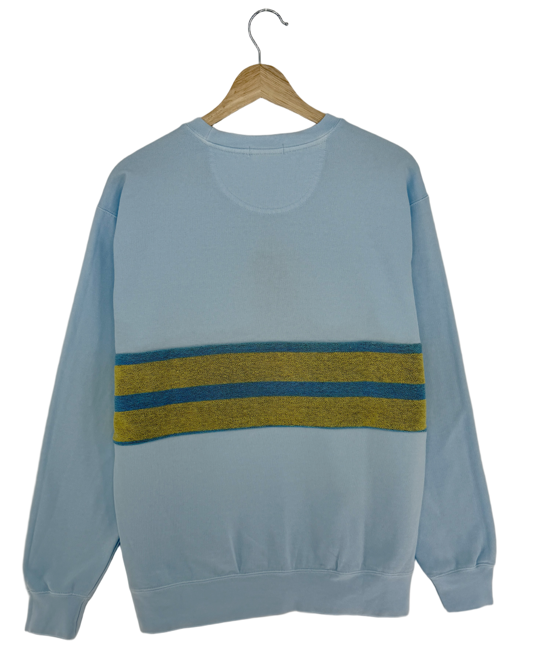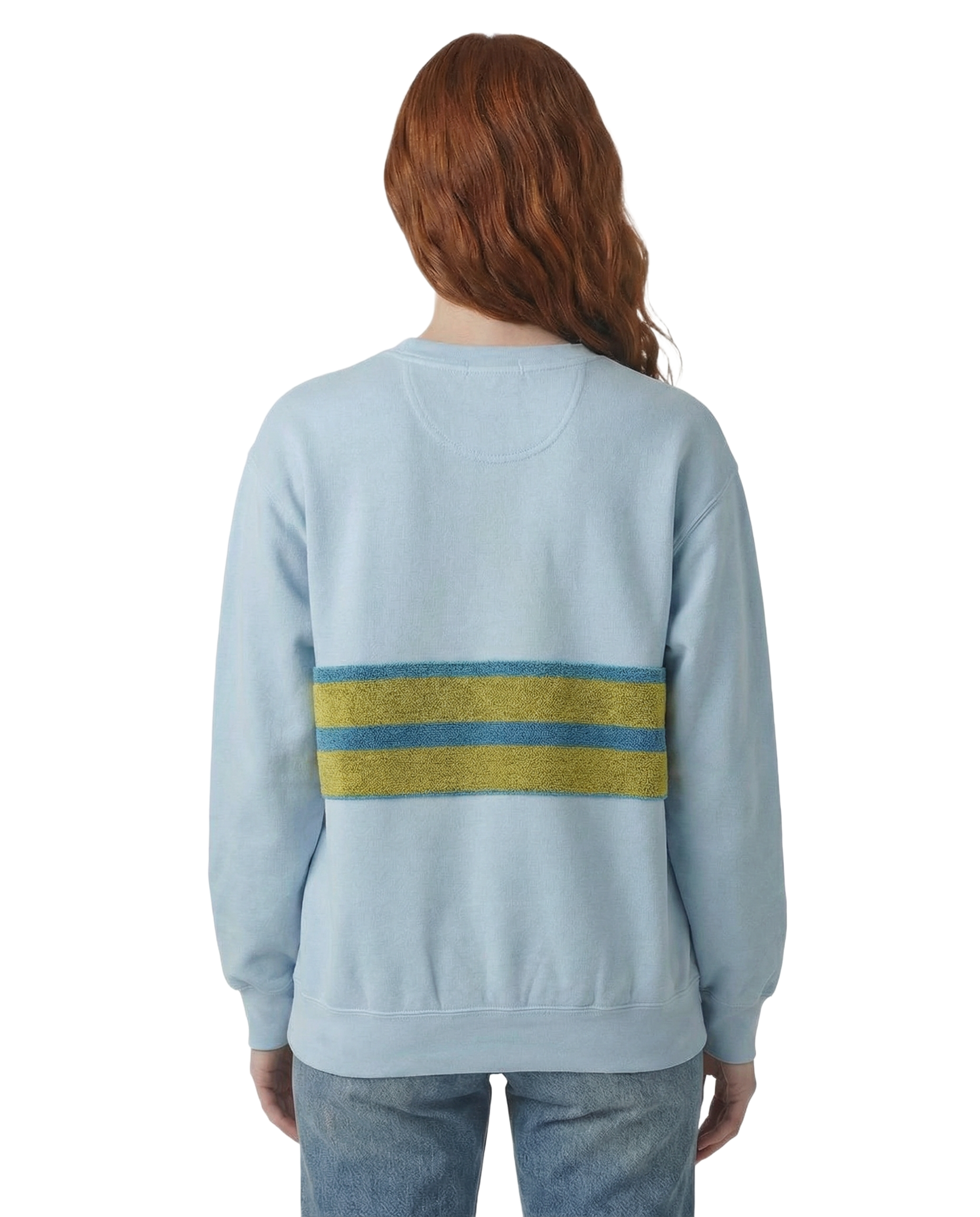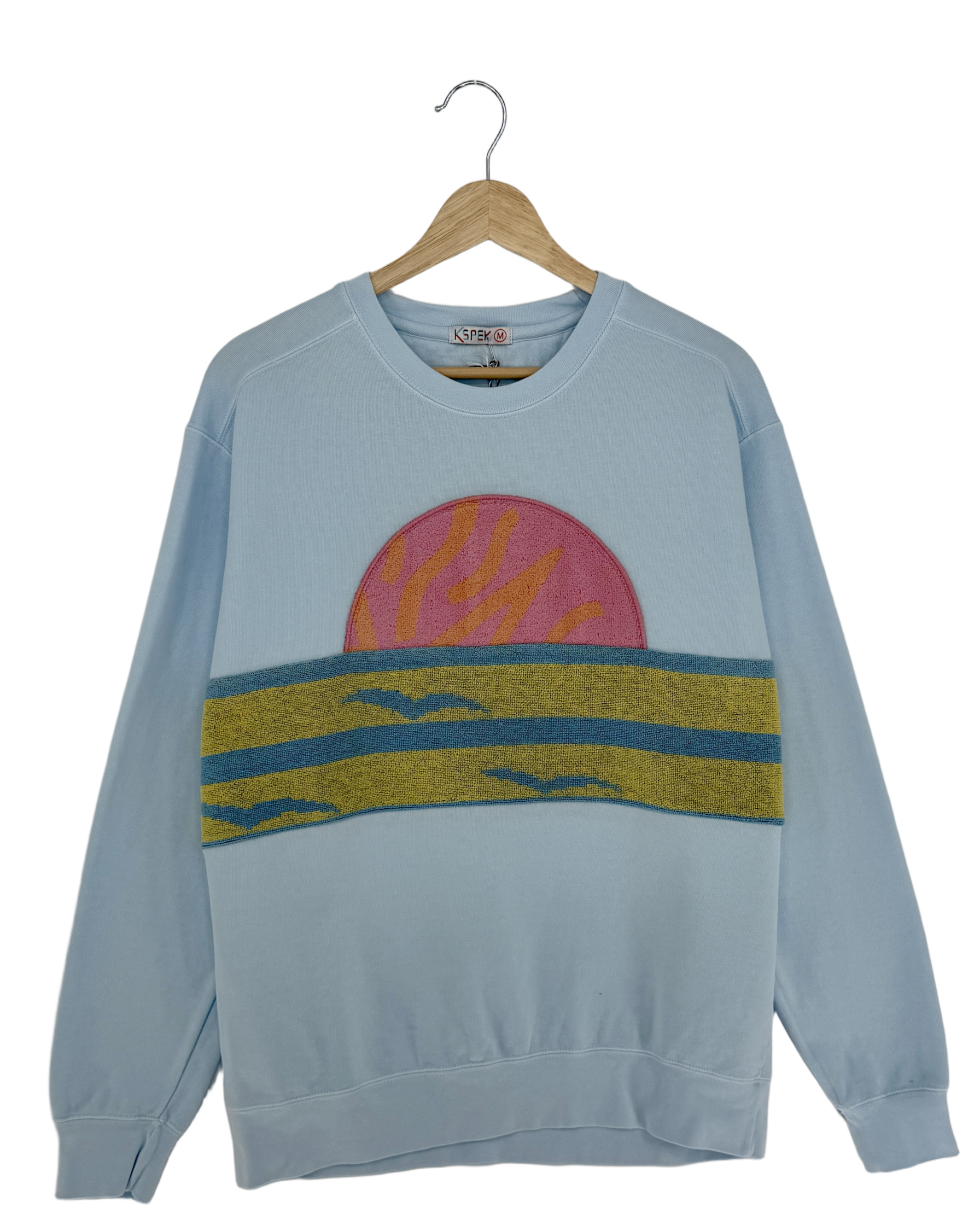 The Sunset Chaser Sweatshirt is a cozy, classic sweatshirt featuring a repurposed vintage beach towel horizon band and sun appliqué. Each piece is truly one-of-a-kind, making it as unique as the person wearing it.