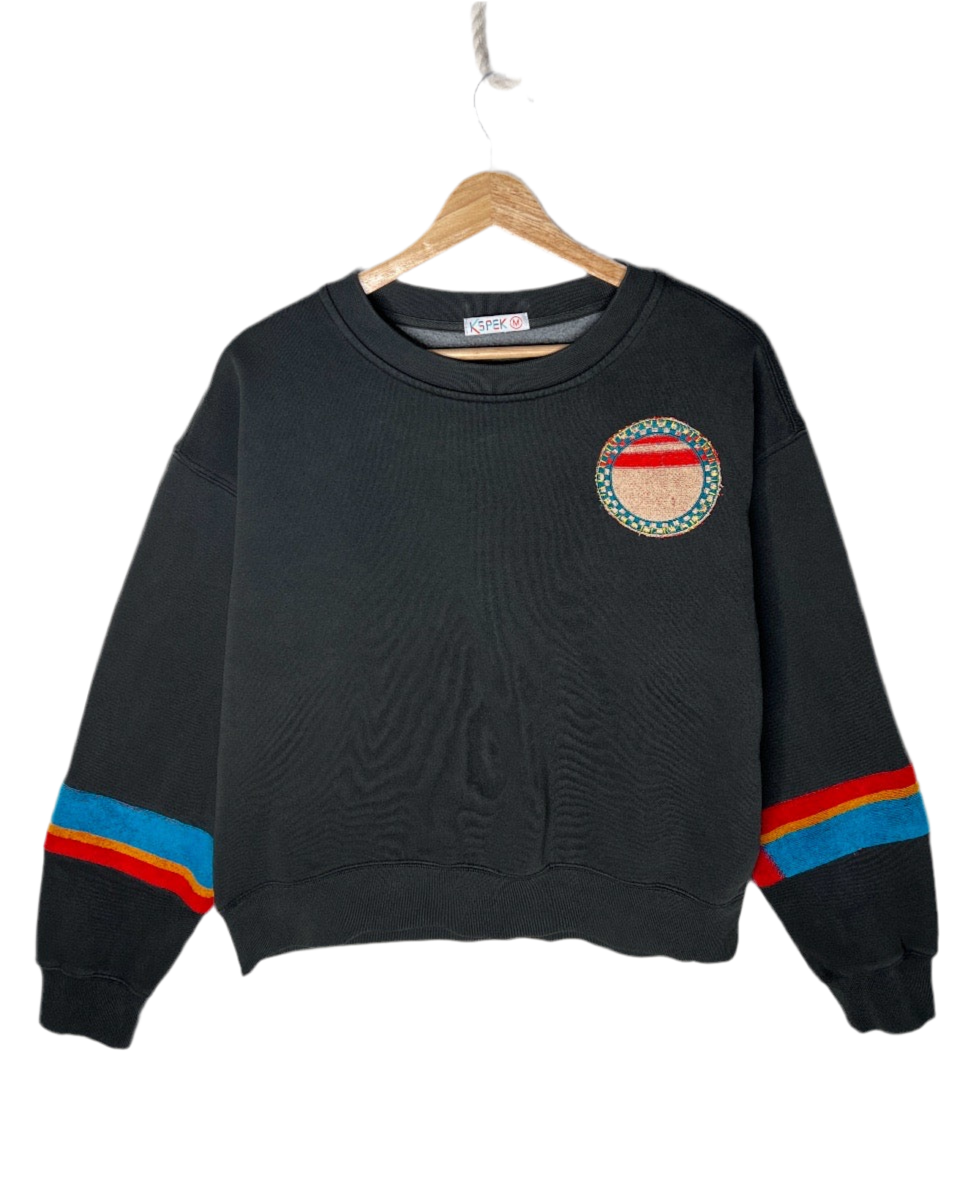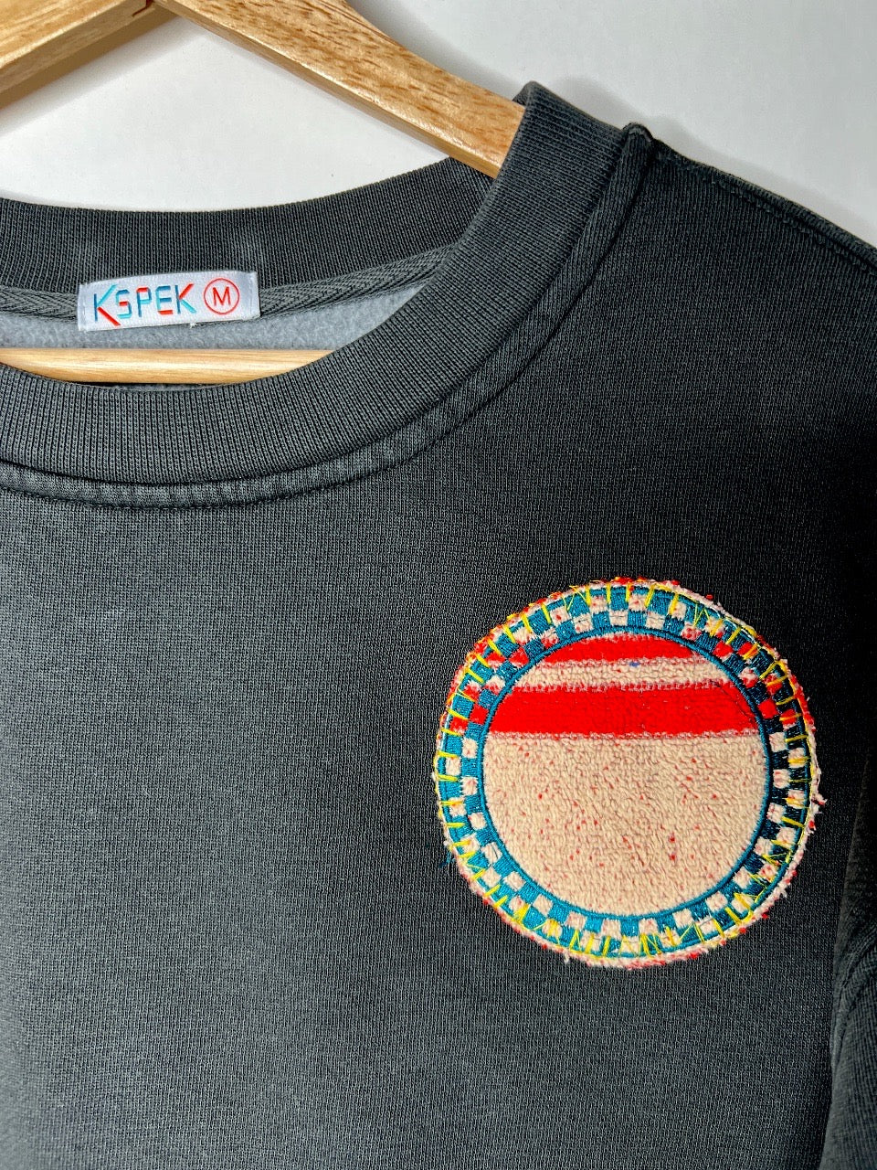 The Tide Check Sweatshirt is a cozy, classic sweatshirt featuring a repurposed vintage beach towel bands at the sleeves and embroidered checkered design framing a circle patch at the chest. Each piece is truly one-of-a-kind, making it as unique as the person wearing it.