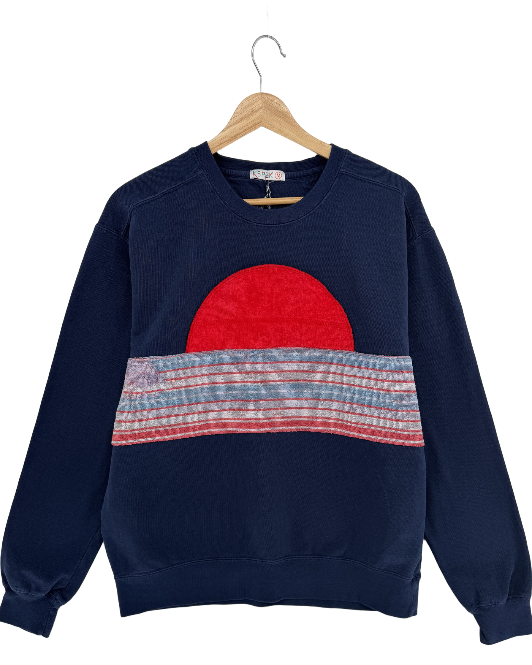 The Sunset Chaser Sweatshirt is a cozy, classic sweatshirt featuring a repurposed vintage beach towel horizon band and sun appliqué. Each piece is truly one-of-a-kind, making it as unique as the person wearing it.