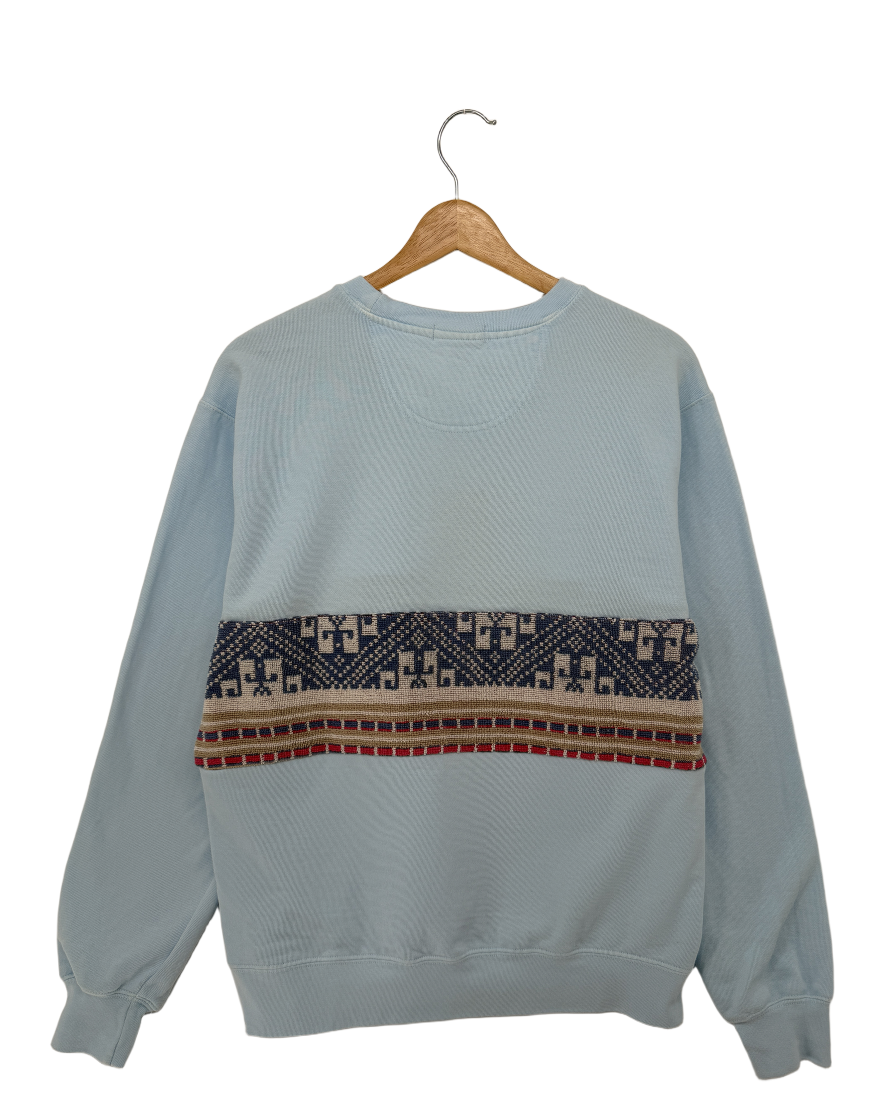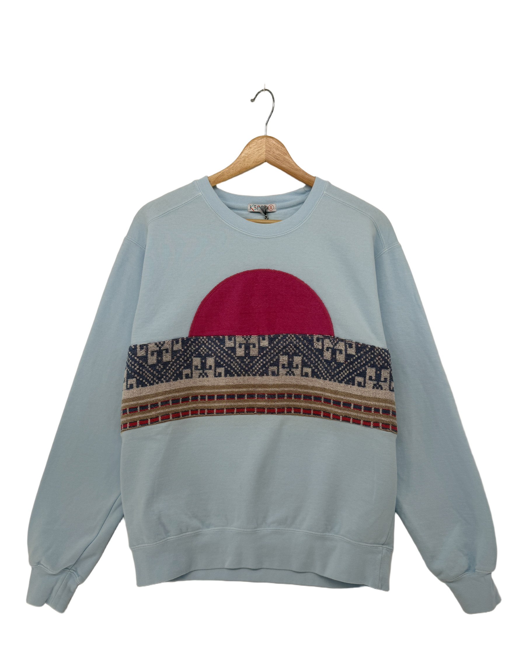 The Sunset Chaser Sweatshirt is a cozy, classic sweatshirt featuring a repurposed vintage beach towel horizon band and sun appliqué. Each piece is truly one-of-a-kind, making it as unique as the person wearing it.