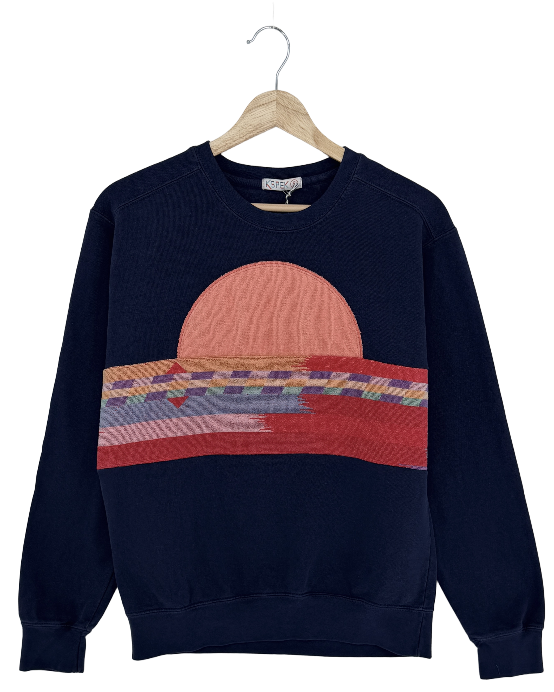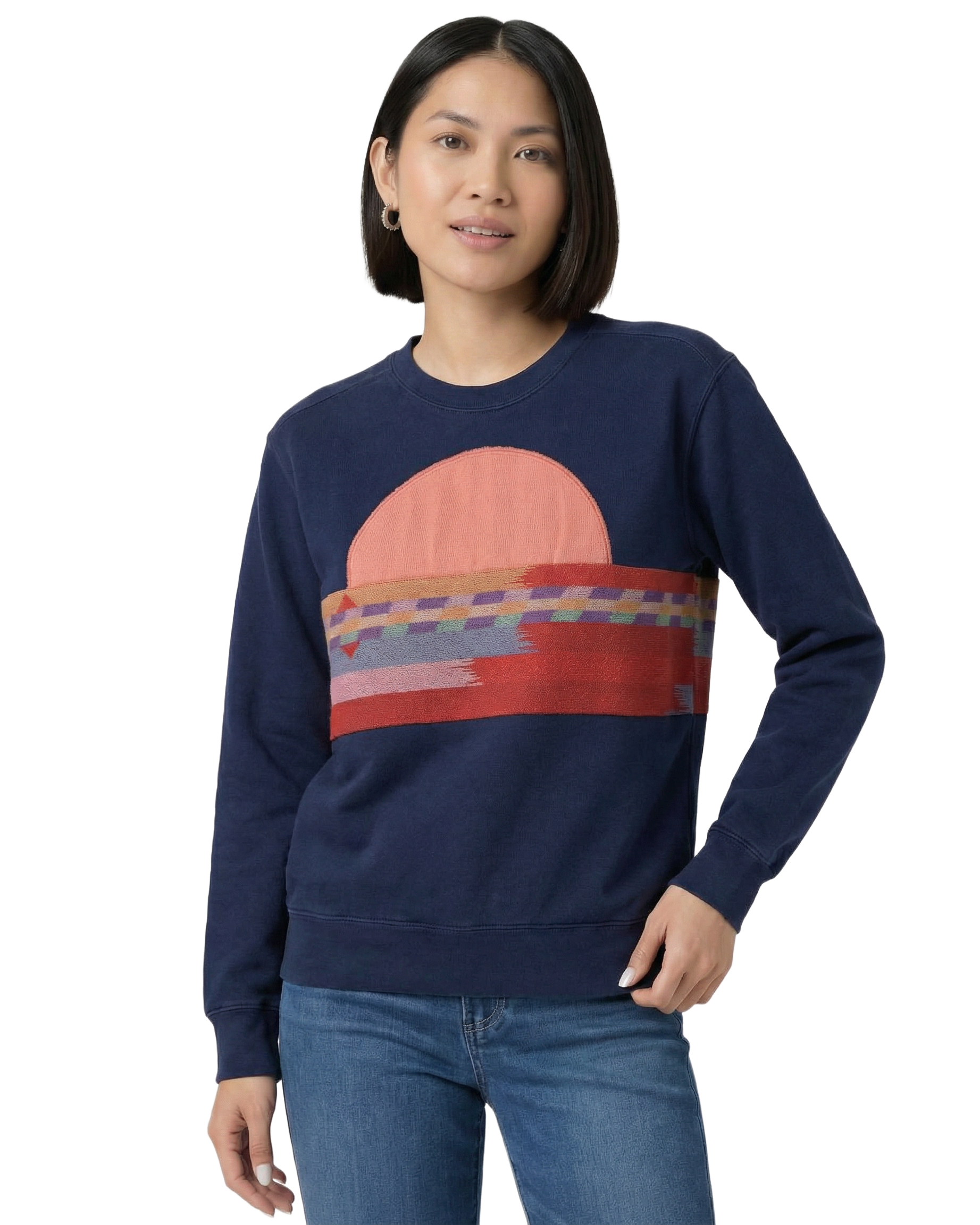 The Sunset Chaser Sweatshirt is a cozy, classic sweatshirt featuring a repurposed vintage beach towel horizon band and sun appliqué. Each piece is truly one-of-a-kind, making it as unique as the person wearing it.