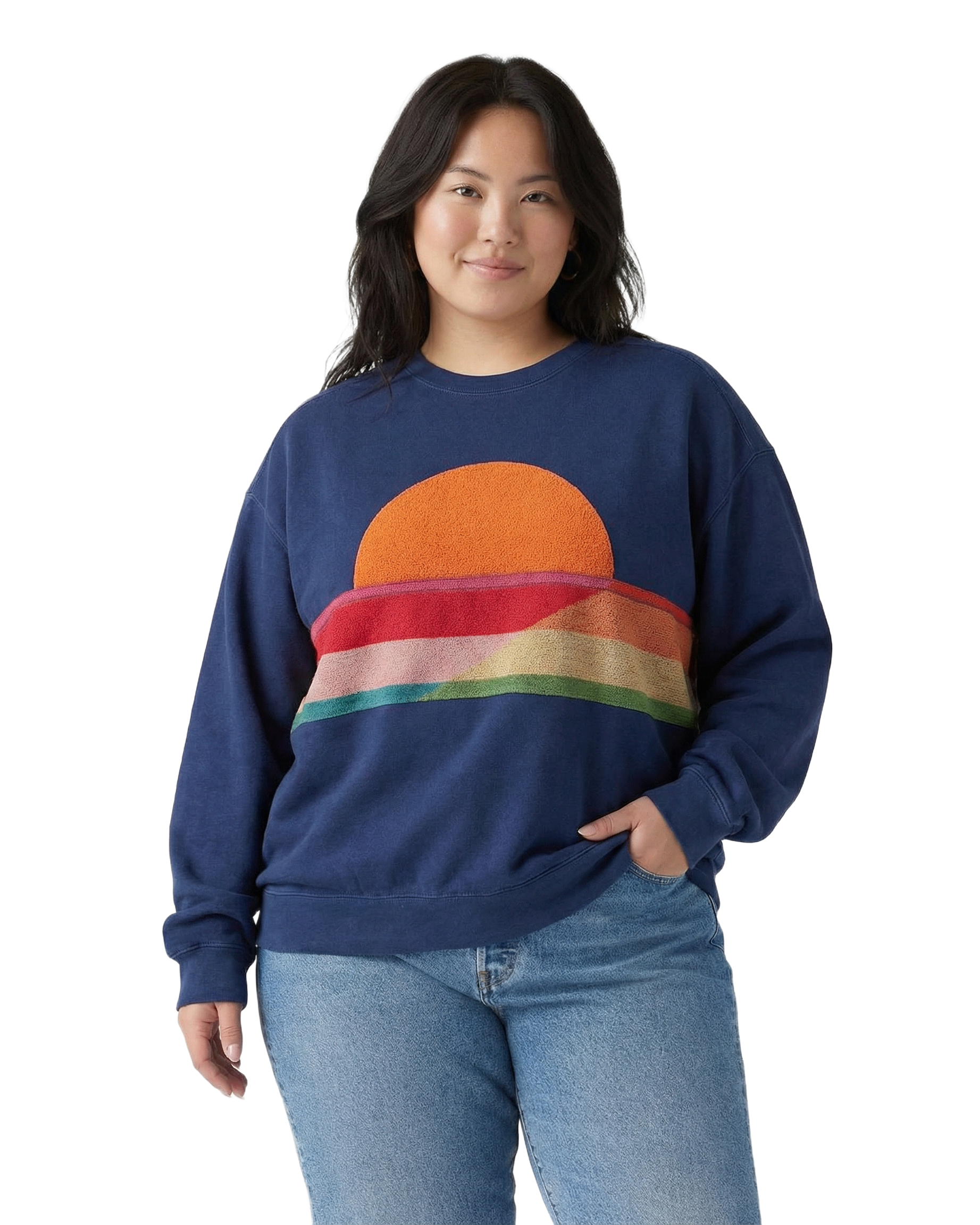 The Sunset Chaser Sweatshirt is a cozy, classic sweatshirt featuring a repurposed vintage beach towel horizon band and sun appliqué. Each piece is truly one-of-a-kind, making it as unique as the person wearing it.