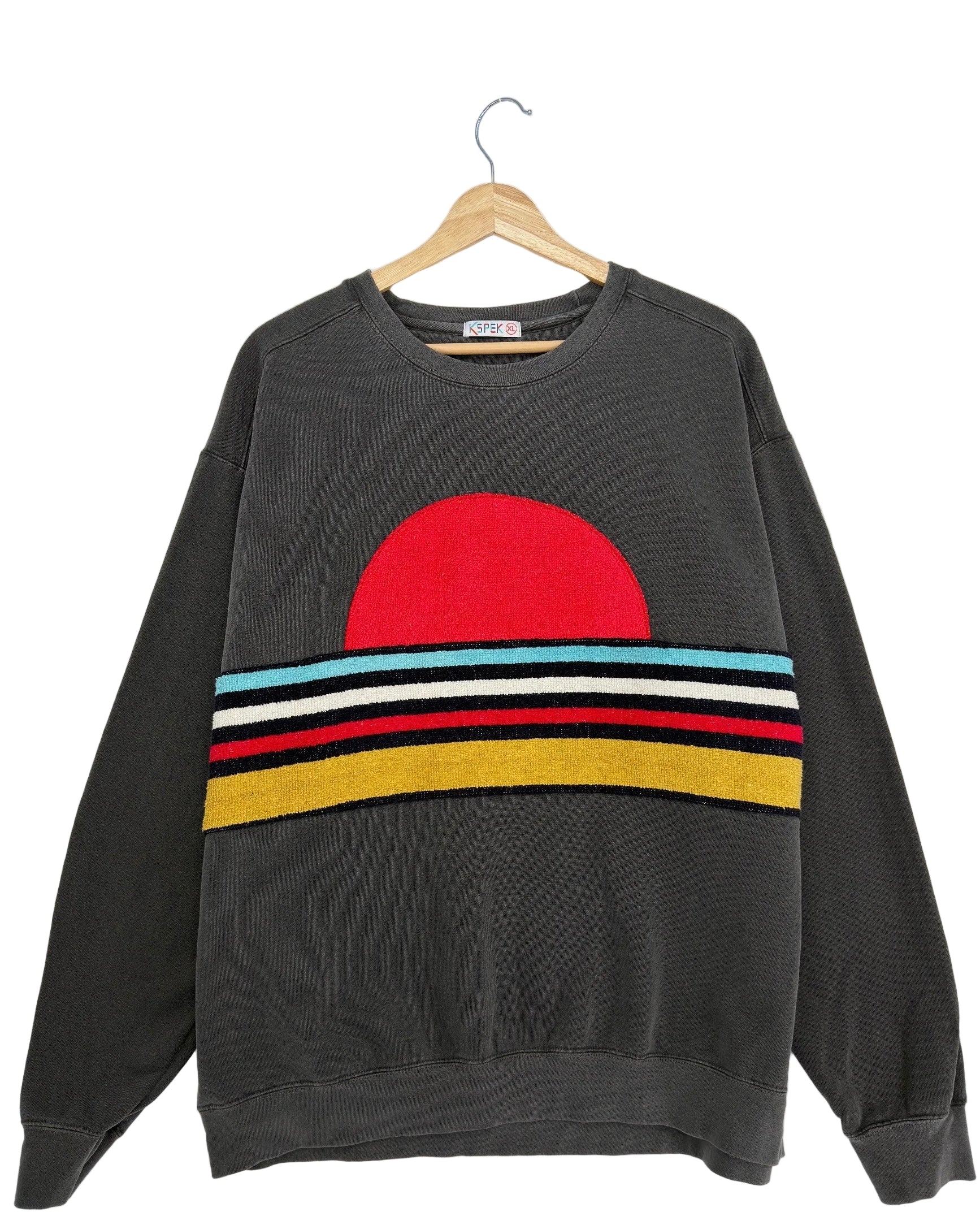 The Sunset Chaser Sweatshirt is a cozy, classic sweatshirt featuring a repurposed vintage beach towel horizon band and sun appliqué. Each piece is truly one-of-a-kind, making it as unique as the person wearing it.